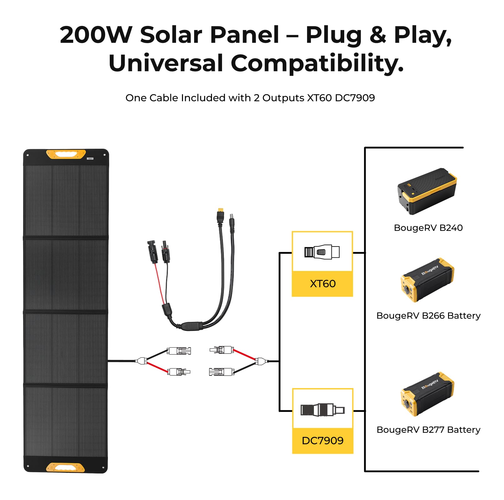 - 200 Watt Solar Panel with Plug-and-Play Compatibility: Includes XT60 and DC7909 connectors for quick and easy setup with compatible devices. Suitable for BougeRV portable fridge batteries and many power stations on the market