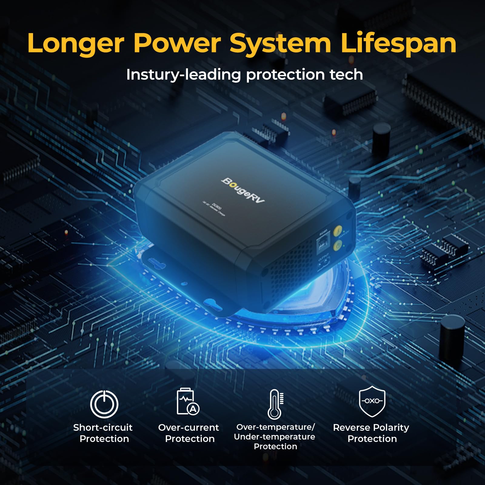 - Ultimate Safety & Protection: BougeRV smart algorithm offers comprehensive protection for your vehicle, the charger, and your power station. This includes protection from over-voltage, reverse polarity, over-current, and temperature extremes. The intelligent, silent fan system keeps noise under 50dB