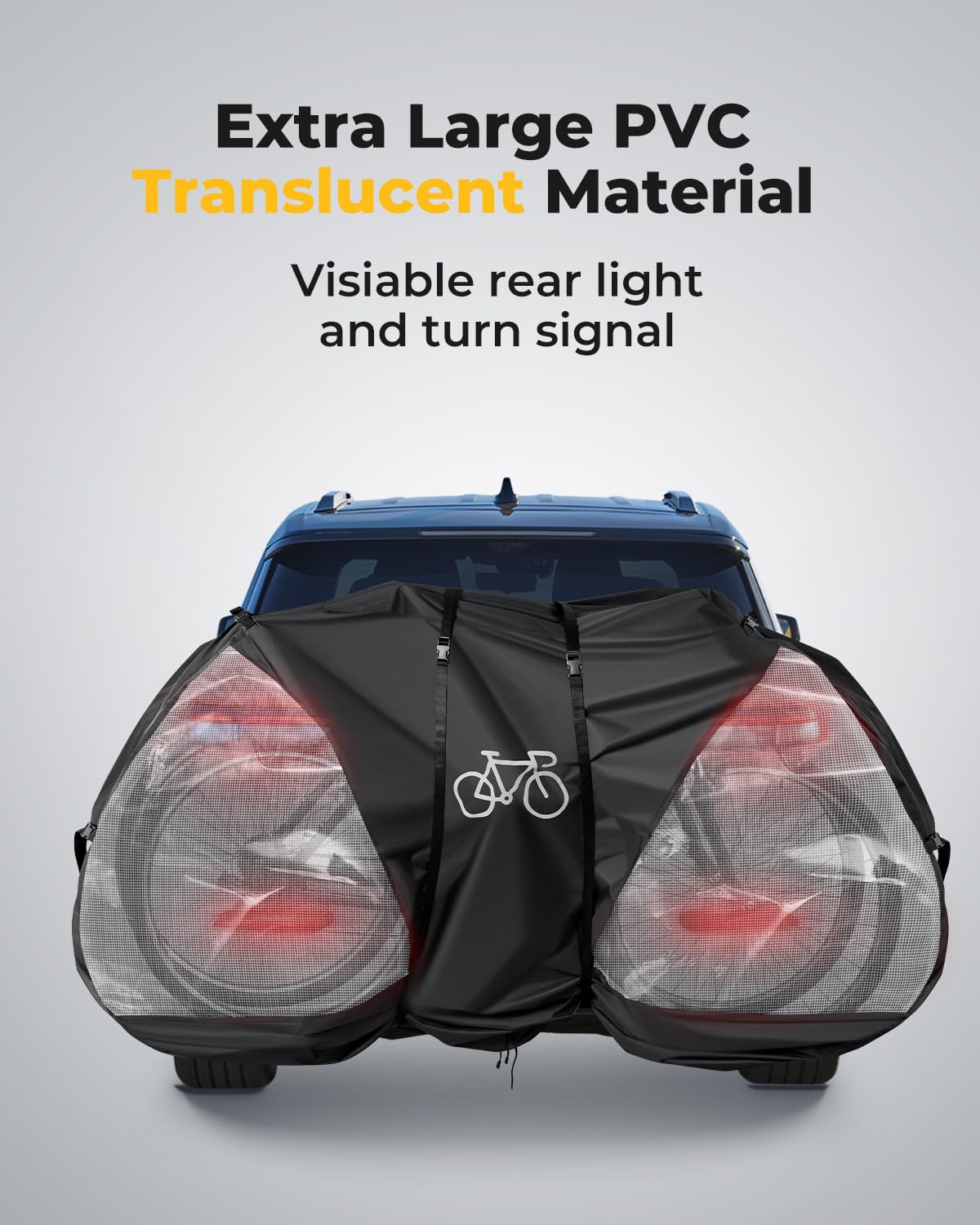 - Tail Light Visibility: Translucent PVC fabric ensures visibility of the rear brake light and turn signal, providing peace of mind when traveling. Suitable for hitch-mounted bike racks on SUVs, RVs, and trucks. Search 'BougeRV hitch bike rack' for a nice fit