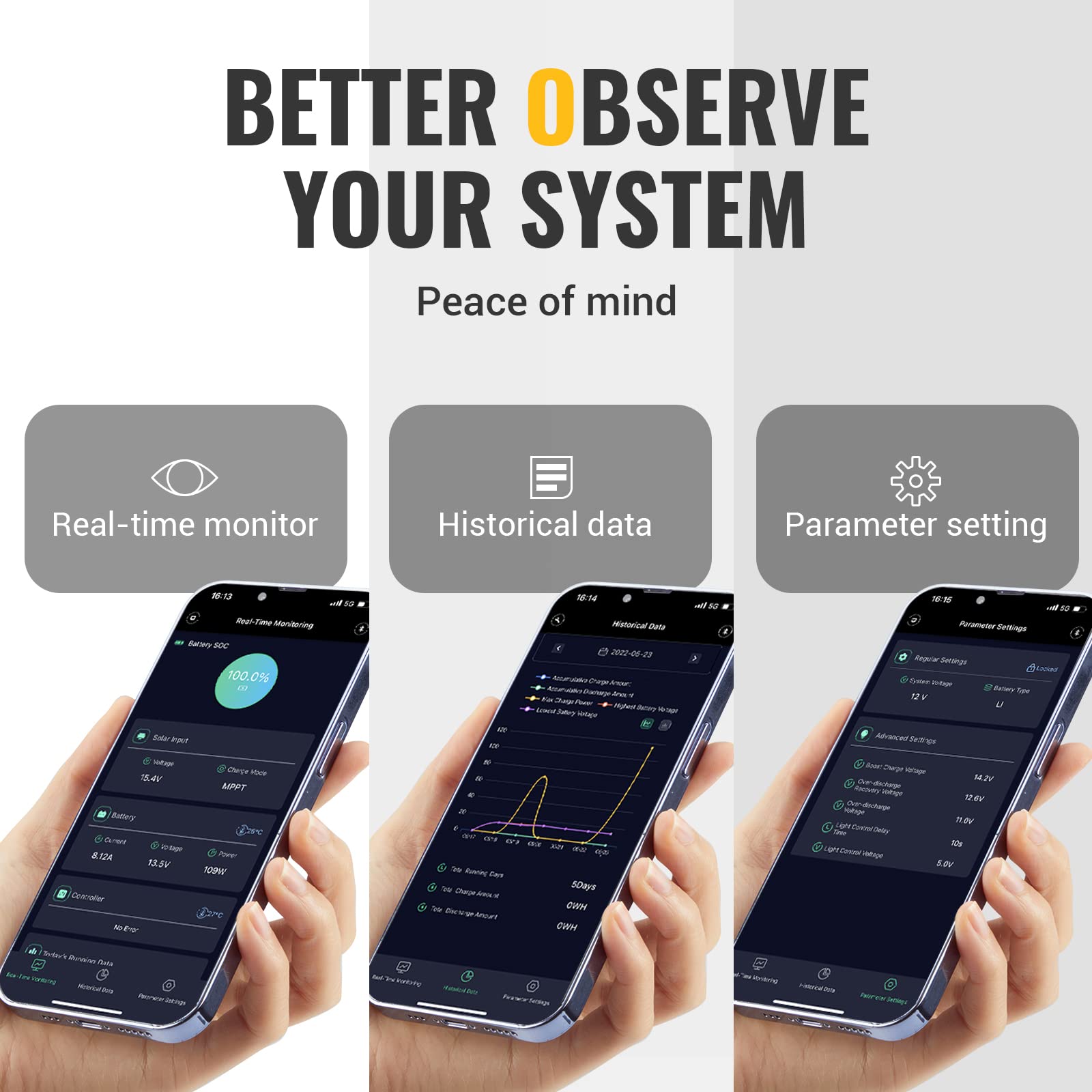 - EASY MONITOR: Pairing the solar controller with your phone via ChargePro 2.0, which makes seeing output and history data a breeze, also allows the charge voltage, current, etc. to be set for different type batteries. The remote app control provides 15 feet signal.